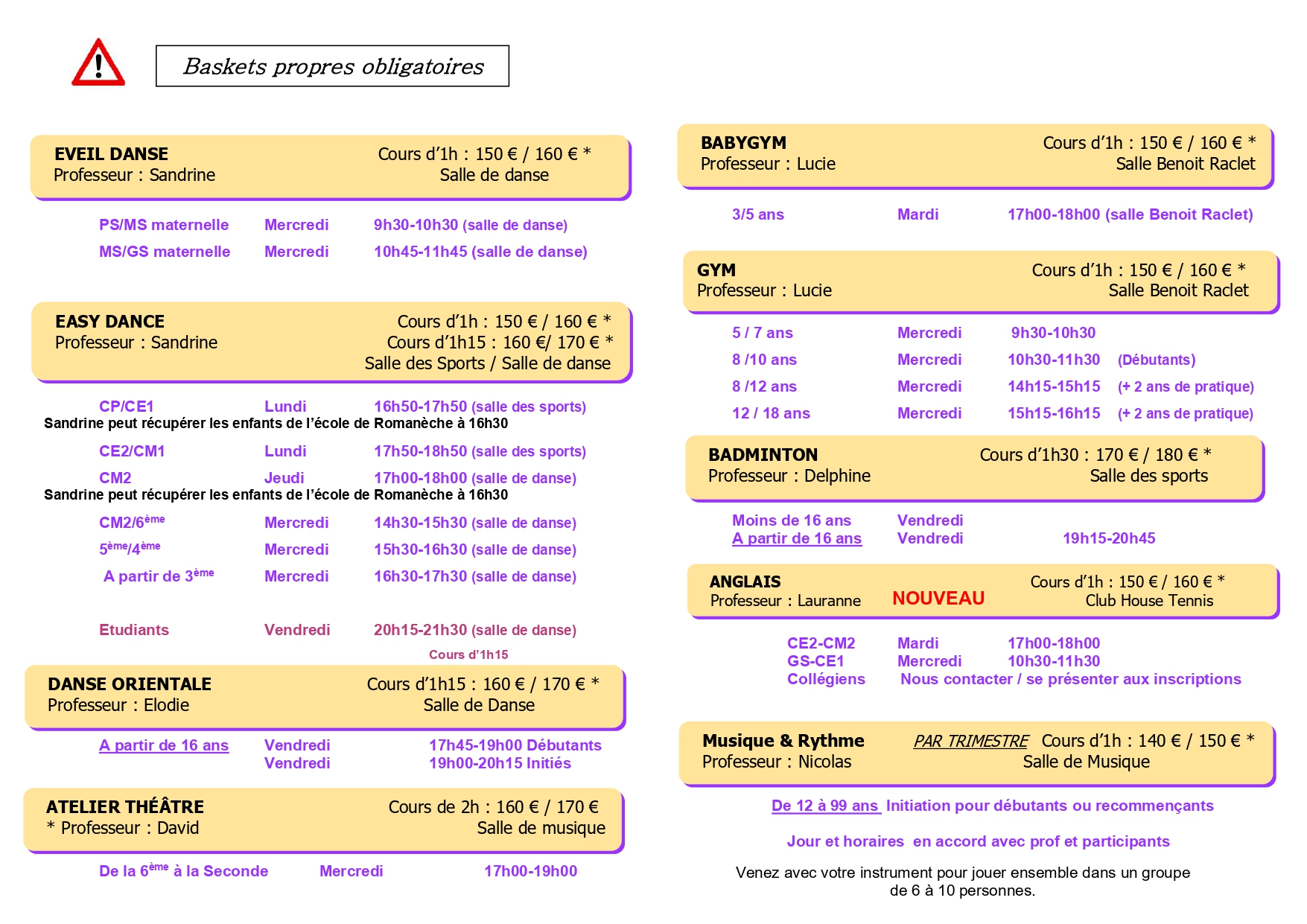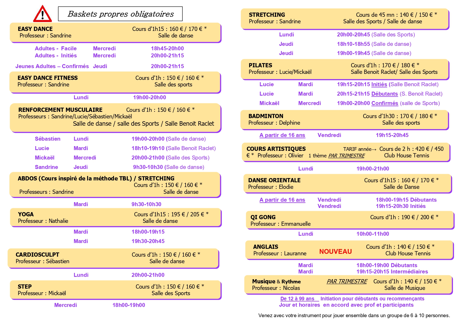 Adultes : Danse, renforcement musculaire, Cardiosculpt, Step, Yoga, Pilate, Qi gong, Stretching, Badminton , danse orientale, Anglais, Art plastique et MusiqueEnfants /ados : Danse, Gym, théâtre, badminton, anglais, musique.