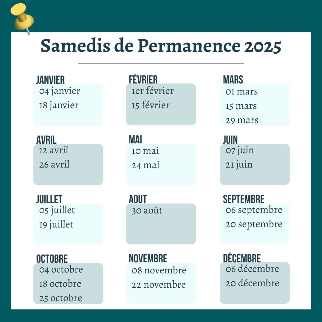 - Certains samedi matin de 9h00 à 12h00 (permanence)